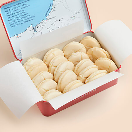 Emblème de la cité corsaire, le macaron de Saint-Jean-de-Luz fait seulement de blancs d’œufs, de sucre et d’amandes - rien à voir avec les macarons parisiens au cœur de ganache - est un biscuit moelleux à une coque. Nous le fabriquons depuis 1914 selon une recette familiale précieusement gardée. On le saupoudre d’un peu de sucre pour plus de gourmandise.