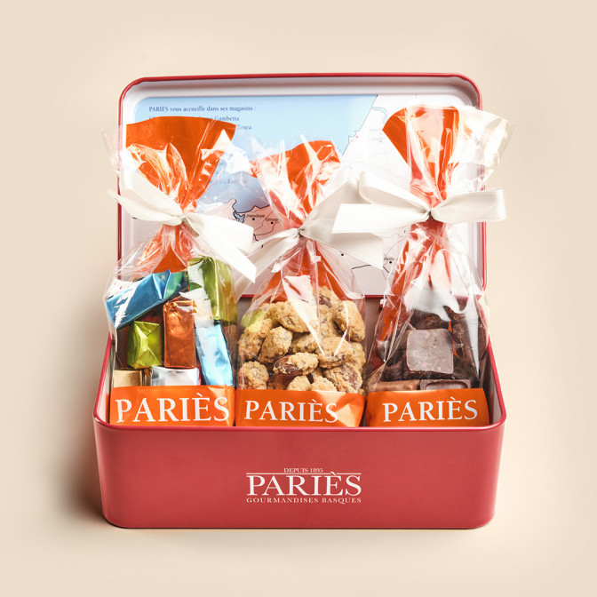 Ingrédients assortiment de bonbons de chocolat fourrés: Sucre, fèves de cacao, pâte de cacao 100%, crème, noisettes, amandes, beurre de cacao, écorces de fruits confits, poudre de lait, beurre, sirop de sucre inverti, éclats de biscuit (farine de blé, extrait de malt d'orge), sirop de glucose, lait concentré entier, pistaches, pâte de pistache, beurre salé, noix de coco râpée, miel, café, cannelle, thé fleurs bleues, menthe Africaine, eau de fleurs d'oranger, vanille en gousses, piment d'Espelette, poivre sauvage de Madagascar, arôme naturel de vanille, stabilisant : sorbitol, émulsifiant : lécithine de soja sans OGM