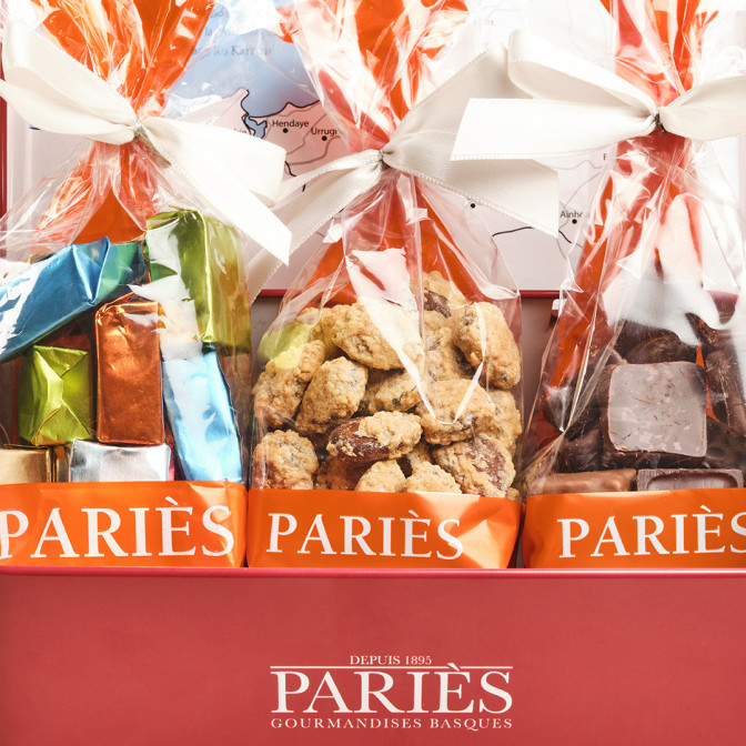 Ingrédients assortiment de Kanougas® (caramels tendres) : Sirop de glucose, sucre, beurre, pâte de cacao 100%, stabilisant: sorbitol, crème liquide, noisettes concassées, noix concassées, amandes grillées, beurre de cacao, café, arôme naturel de vanille, piment d'Espelette, sel