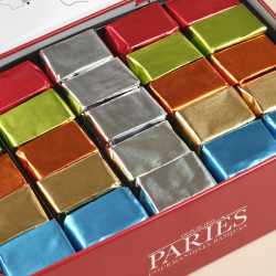 Ingrédients : Sirop de glucose, sucre, beurre, pâte de cacao 100%, stabilisant: sorbitol, crème liquide, noisettes concassées, noix concassées, amandes grillées, beurre de cacao, café, arôme naturel de vanille, piment d'Espelette, sel